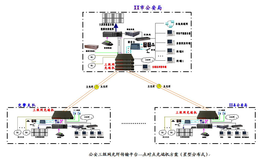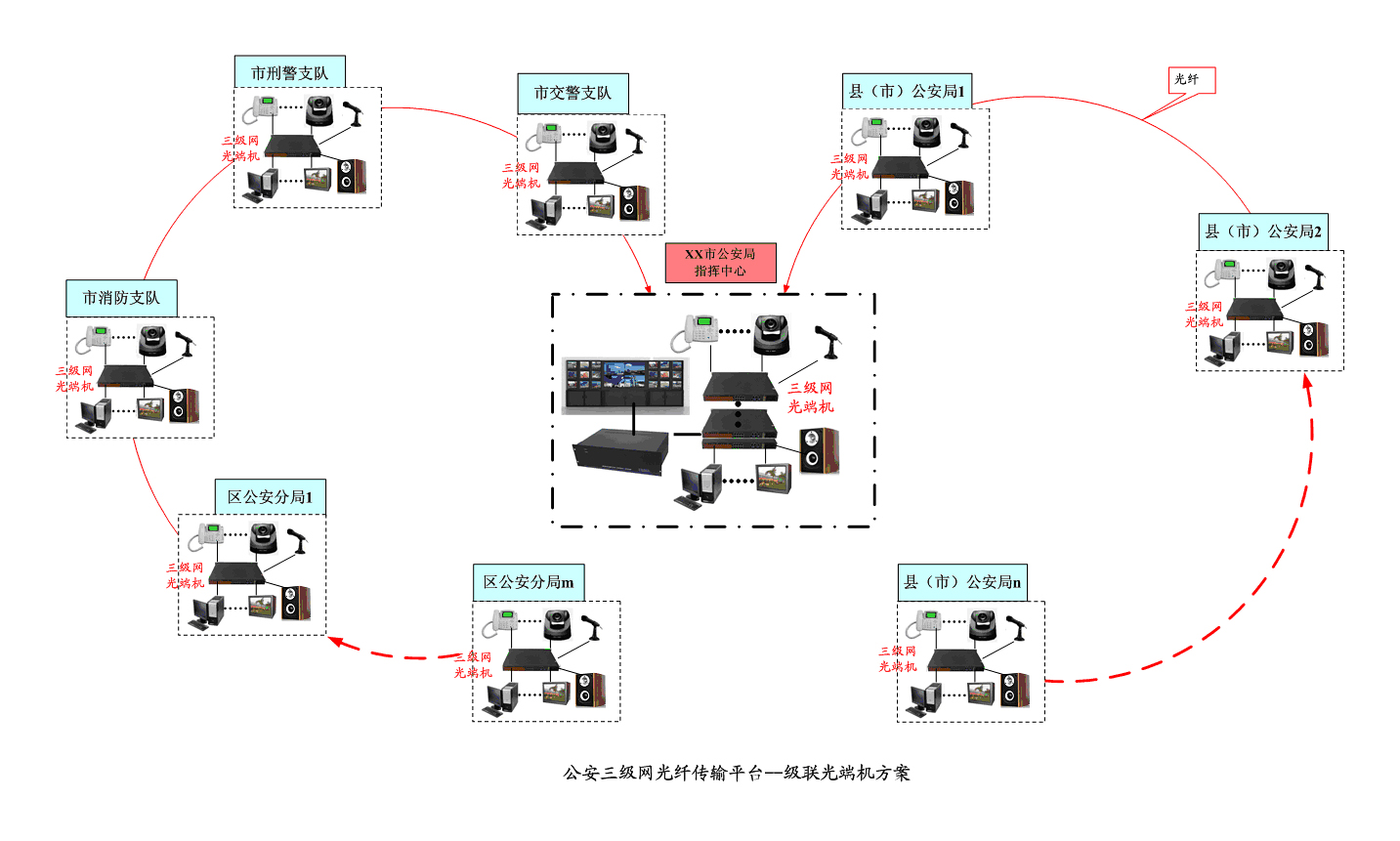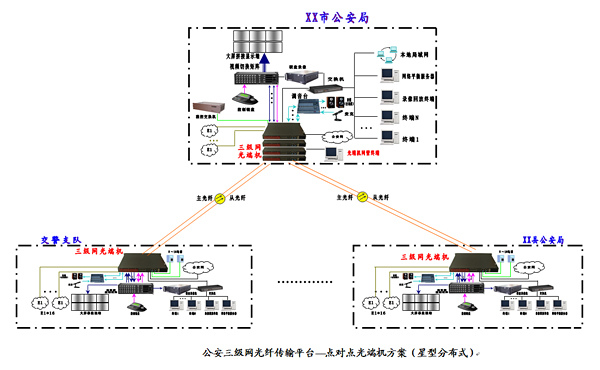 公安三四網網絡系統分別指地級市公安局到區縣(或縣級市)公安局、區縣(或縣級市)公安局到派出所之間的通信聯網,根據租用光纖的網絡結構,可分為點對點結構、環網結構。
