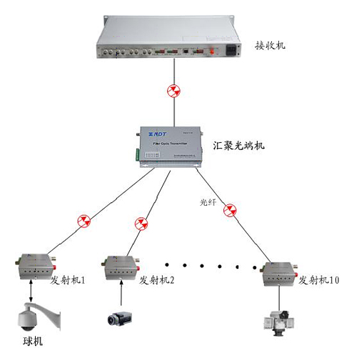 匯聚光端機能夠同時接收來自10只單路視頻或單路視頻+反向數據發射機的光信號,然后通過一根光纖再發射出去,在接收端,可將10路視頻信號還原出來。優點是:1:信號沒有損失;2:大大延長了傳輸距離;3:將分散輸出的多路視頻集中到一塊板卡上輸出,便于管理,同時也大大增加了配套機箱管理的視頻容量,性價比高。同時可以把反向控制數據傳輸到各發射機??蛇x擇壁掛式、1U機架式或4U插卡式等多種安裝結構形式。
