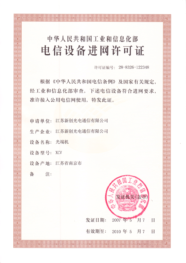 2007-10-14,江蘇新創光端機通過中華人民共和國信息產業部認證并取得入網資格證書。