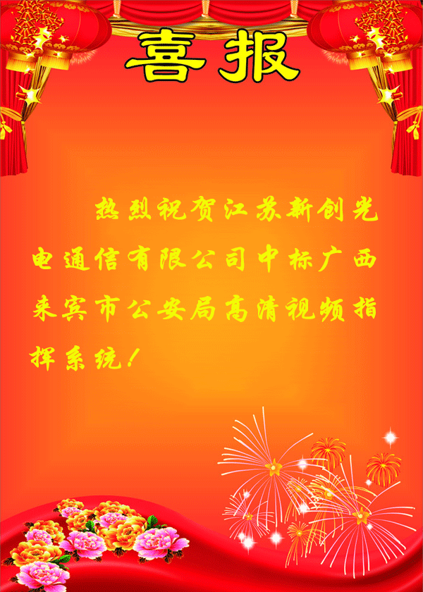 2010-02-04,江蘇新創全數字DVI、HDMI高清光端機中標廣西來賓市公安局高清視頻指揮系統。