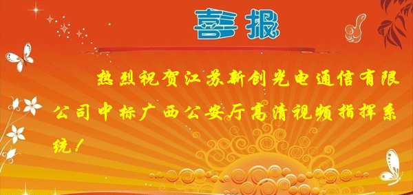2010-02-26,江蘇新創HDMI全數字高清光端機中標廣西公安廳高清視頻指揮系統。