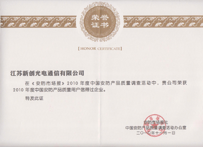 2010-10-27,江蘇新創喜獲中國安防產品質量調查活動辦公室和安防市場報聯合頒發的“中國安防質量用戶信得過企業”證書。