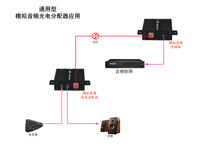 模擬音頻光電分配器是江蘇新創自主研發創新,專門為模擬音頻在電纜或單模或多模、塑料光纖上無失真遠距離延長、中繼分配或擴展而設計的。通過使用本分配器,你可以輕松將CD播放機、調音臺、音頻錄放設備、話筒和音頻前置放大器、DVD、機頂盒、非線性編輯設備、音頻信號發生器、或任何AV信號源輸出的模擬音頻同時清晰、無失真的通過光纖或電纜分配傳輸到遠端現場或本地的多臺立體聲音響或功放、音頻廣播…