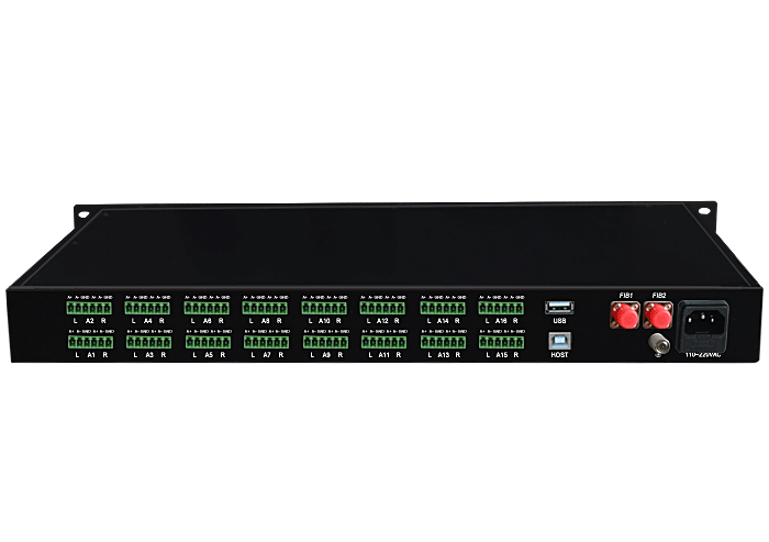 配置 1/2/4/8/16/24/32路模擬音頻/USB光電端口服務器,卡儂/工業接線子/3.5mm/RCA接口,平衡/非平衡,立體聲/單聲道,1路USB主口輸入、可選多路下游口輸出,可選多路USB和模擬音頻電纜或光纖接口,可選內置數字隔離器,最大隔離電壓2500/5000Vrms,可選內置5/10KA浪涌保護器,獨立/冗余供電(DC18~36V/5V),壁掛/機架,高可靠型
