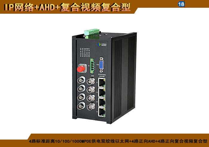 4路標準距離10/100M雙絞線以太網+4路正向AHD+4路正向復合視頻復合信號型光端機發射機/接收機,1/2/4/8擴容口可選,復合信號可選,單模/多模/塑料,1/2纖,ST/FC/SC/LC/SFP光接口,15/20/25/32dB,獨立/冗余/總線供電(DC18~36V/5V),導軌,工業型,非網管/網管/帶光纖數字診斷網管 |
