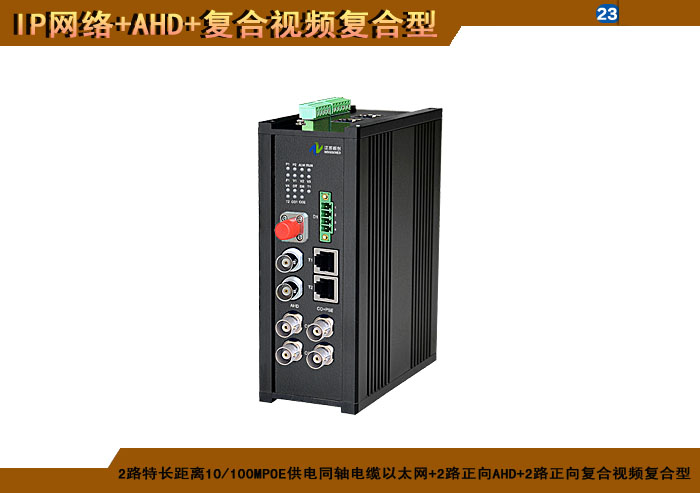 2路標準距離10/100MPOE供電雙絞線以太網+2路正向AHD+2路正向復合視頻復合信號型光端機發射機/接收機,1/2/4/8擴容口可選,復合信號可選,單模/多模/塑料,1/2纖,ST/FC/SC/LC/SFP光接口,15/20/25/32dB,獨立/冗余/總線供電(DC18~36V/5V),導軌,工業型,非網管/網管/帶光纖數字診斷網管 |
