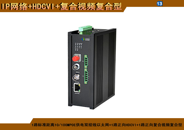 1路特長(zhǎng)距離10/100MPOE供電雙絞線以太網(wǎng)+1路正向HDCVI+1路正向復(fù)合視頻復(fù)合信號(hào)型光端機(jī)發(fā)射機(jī)/接收機(jī),1/2/4/8擴(kuò)容口可選,復(fù)合信號(hào)可選,單模/多模/塑料,1/2纖,ST/FC/SC/LC/SFP光接口,15/20/25/32dB,獨(dú)立/冗余/總線供電(DC18~36V/5V),導(dǎo)軌,工業(yè)型,非網(wǎng)管/網(wǎng)管/帶光纖數(shù)字診斷網(wǎng)管 |