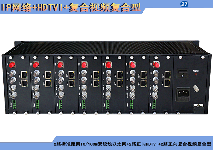 2路標準距離10/100M雙絞線以太網+2路正向HDTVI+2路正向復合視頻復合信號型光端機發射機/接收機,1/2/4/8擴容口可選,復合信號可選,單模/多模/塑料,1/2纖,ST/FC/SC/LC/SFP光接口,15/20/25/32dB,獨立/冗余/總線供電(DC18~36V/5V),導軌,工業型,非網管/網管/帶光纖數字診斷網管 |