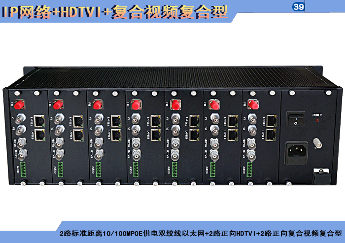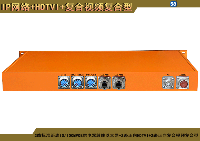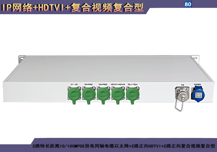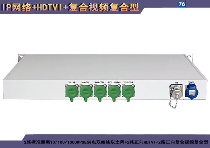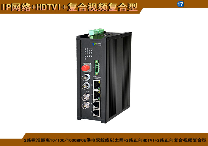 2路特長距離10/100MPOE供電雙絞線以太網+2路正向HDTVI+2路正向復合視頻復合信號型光端機發射機/接收機,1/2/4/8擴容口可選,復合信號可選,單模/多模/塑料,1/2纖,ST/FC/SC/LC/SFP光接口,15/20/25/32dB,獨立/冗余/總線供電(DC18~36V/5V),導軌,工業型,非網管/網管/帶光纖數字診斷網管 |
