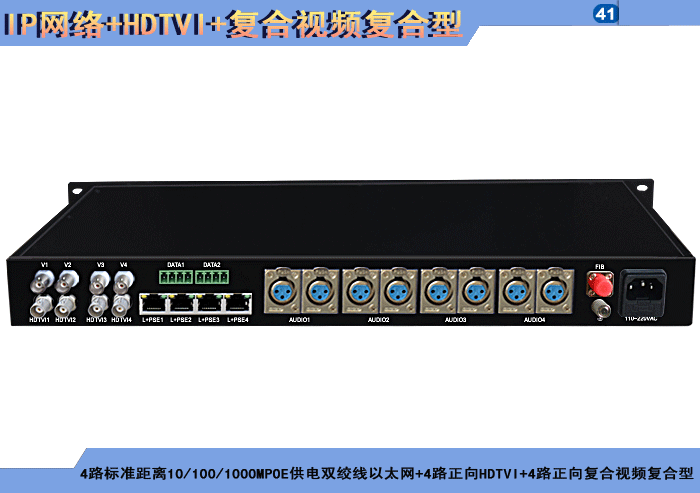 1/2/4路特長距離10/100MPOE供電同軸電纜以太網+1/2/4路正向HDTVI+1/2/4路正向復合視頻復合信號型光端機發射機/接收機,復合信號可選,單模/多模/塑料,1/2纖,獨立/冗余供電,機架,高可靠型 |