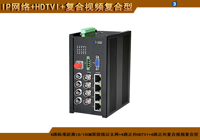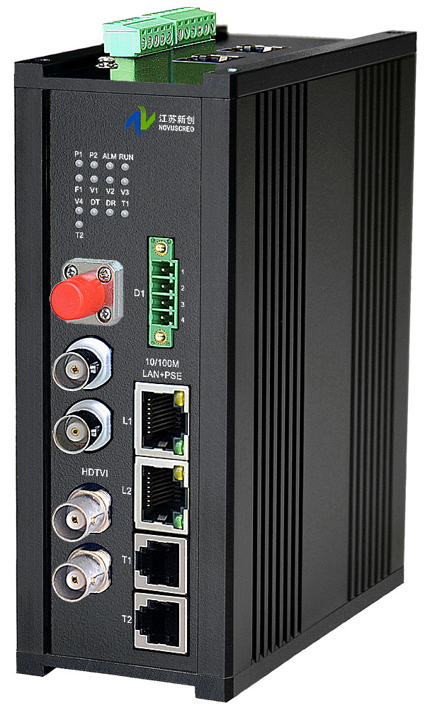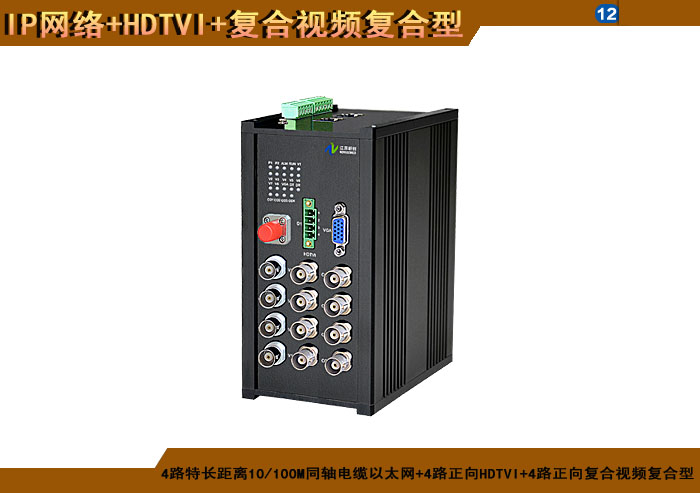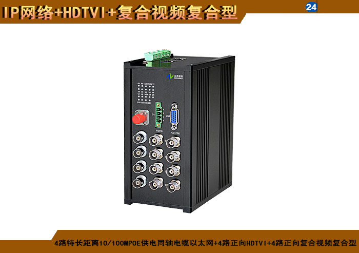 4路特長距離10/100M雙絞線以太網+4路正向HDTVI+4路正向復合視頻復合信號型光端機發射機/接收機,1/2/4/8擴容口可選,復合信號可選,單模/多模/塑料,1/2纖,ST/FC/SC/LC/SFP光接口,15/20/25/32dB,獨立/冗余/總線供電(DC18~36V/5V),導軌,工業型,非網管/網管/帶光纖數字診斷網管 |