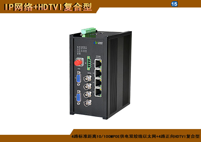 4路標準距離10/100MPOE供電雙絞線以太網+4路正向HDTVI復合信號型光端機發射機/接收機,1/2/4/8擴容口可選,復合信號可選,單模/多模/塑料,1/2纖,ST/FC/SC/LC/SFP光接口,15/20/25/32dB,獨立/冗余/總線供電(DC18~36V/5V),導軌,工業型,非網管/網管/帶光纖數字診斷網管 |