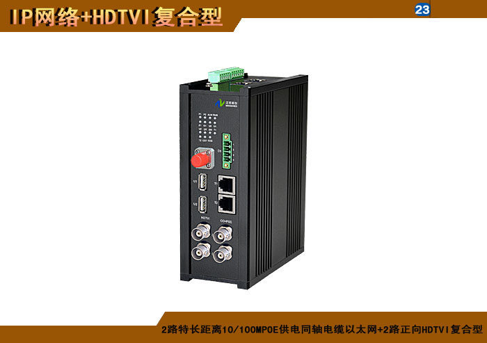 2路標準距離10/100MPOE供電雙絞線以太網+2路正向HDTVI復合信號型光端機發射機/接收機,1/2/4/8擴容口可選,復合信號可選,單模/多模/塑料,1/2纖,ST/FC/SC/LC/SFP光接口,15/20/25/32dB,獨立/冗余/總線供電(DC18~36V/5V),導軌,工業型,非網管/網管/帶光纖數字診斷網管 |