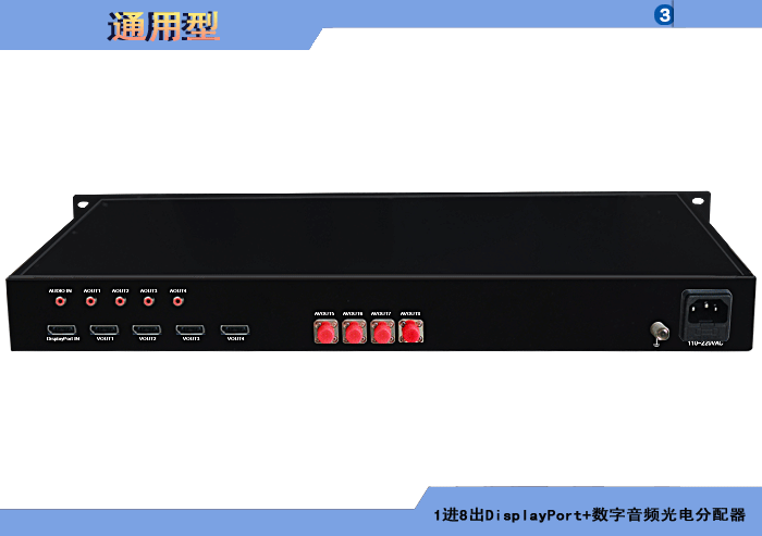 1進8出DisplayPort數字音頻光電分配器,內置數字均衡器/抖動去除器可選,AES/EBU(卡儂/BNC)、S/PDIF(RCA)、光纖數字音頻接口,獨立/冗余供電,壁掛,通用型 |
