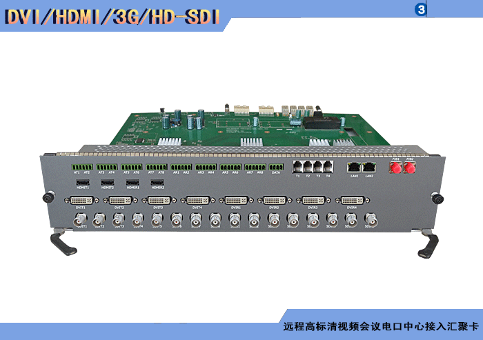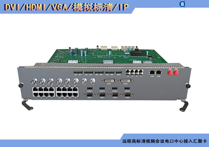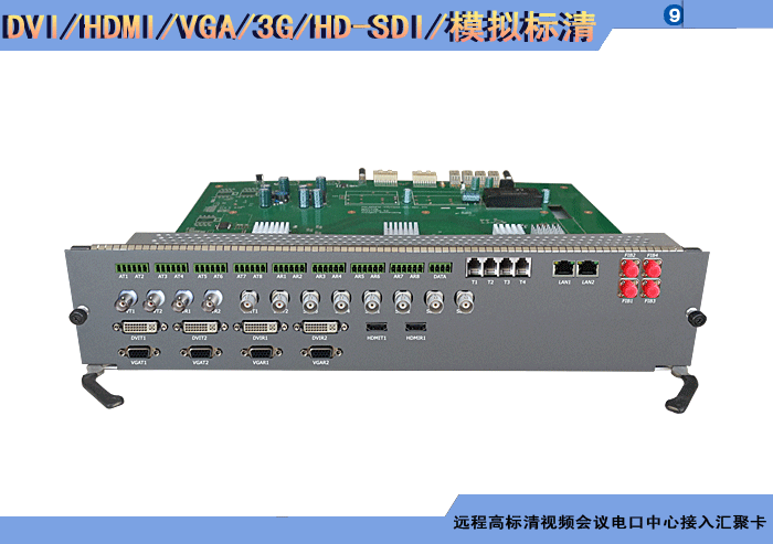 遠程高標清視頻會議電口中心接入匯聚卡,1/2/4/8路DVI/HDMI/DP/VGA/YPbPr/3G/HD-SDI/模擬標清視頻攝像機電口輸出,1/2/4/8路DVI/HDMI/DP/VGA/YPbPr/3G/HD-SDI/模擬標清視頻顯示屏電口輸入,1/2/4/8路模擬/數字雙向立體聲音頻可選,1/2/4/8路可選數據,多路電話或百兆/千兆以太網可選,單模/多模,獨立/冗余供電,1/2/3/4U機架,非網管/網管/帶光纖數字診斷網管 |