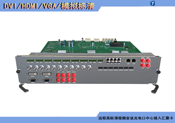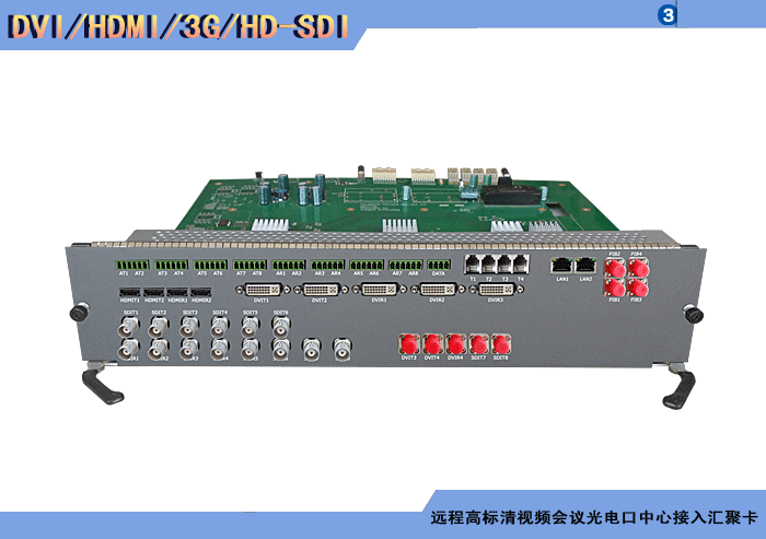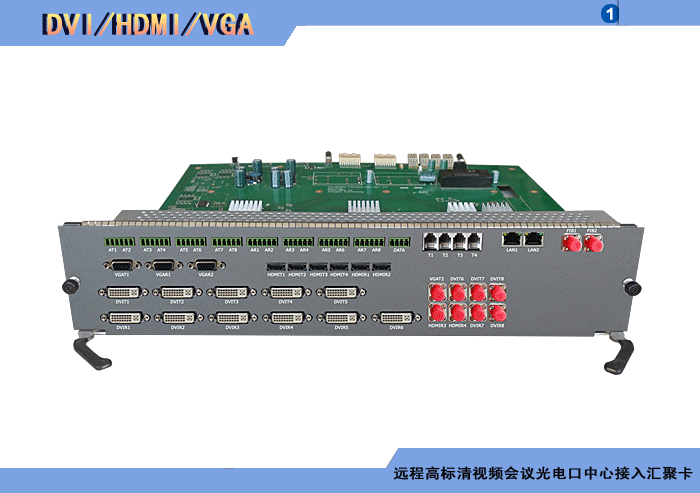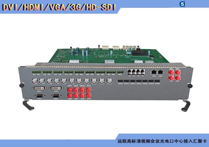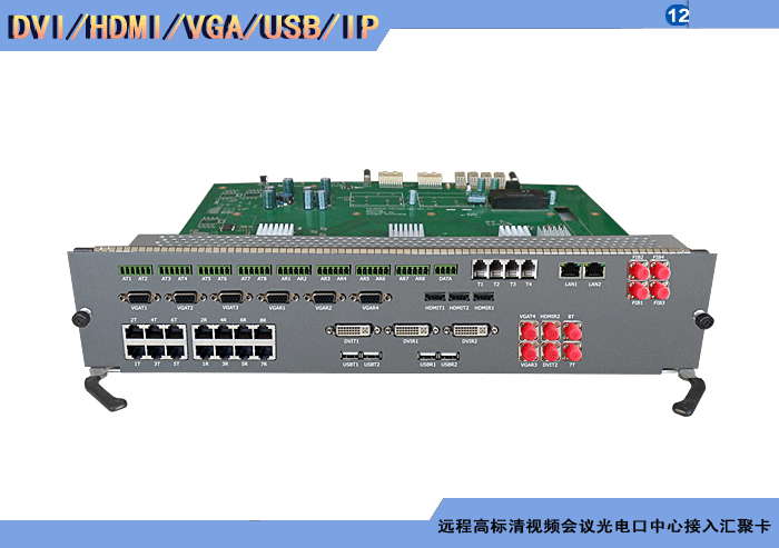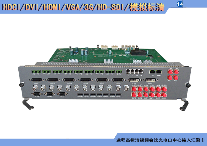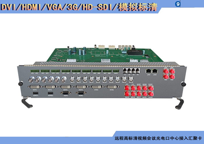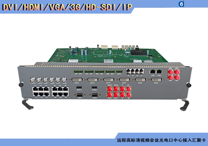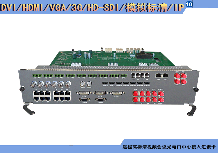 遠程高標清視頻會議光電口中心接入匯聚卡,1/2/4/8路DVI/HDMI/DP/VGA/YPbPr/3G/HD-SDI/模擬標清視頻攝像機光電口輸出,1/2/4/8路DVI/HDMI/DP/VGA/YPbPr/3G/HD-SDI/模擬標清視頻顯示屏光電口輸入,1/2/4/8路模擬/數字雙向立體聲音頻可選,1/2/4/8路可選數據,多路電話或百兆/千兆以太網可選,單模/多模,獨立/冗余供電,1/2/3/4U機架,非網管/網管/帶光纖數字診斷網管 |