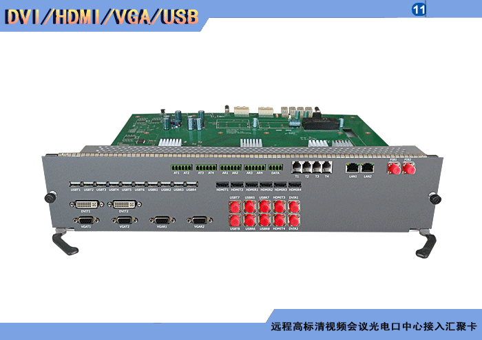 遠程高標清視頻會議光電口中心接入匯聚卡,1/2/4/8路HDCI/DVI/HDMI/DP/VGA/YPbPr/3G/HD-SDI/模擬標清視頻攝像機光電口輸出,1/2/4/8路DVI/HDMI/DP/VGA/YPbPr/3G/HD-SDI/模擬標清視頻顯示屏光電口輸入,1/2/4/8路模擬/數字雙向立體聲音頻可選,1/2/4/8路可選數據,多路電話或百兆/千兆以太網可選,單模/多模,獨立/冗余供電,1/2/3/4U機架,非網管/網管/帶光纖數字診斷網管 |