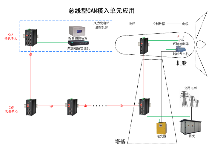 CAN總線級聯型接入單元已經廣泛應用在風力發電站現場和控制中心的塔座主控制器機柜、機艙控制站機柜、變槳距系統、變流器系統、大功率變流器通訊 偏航系統、發電機系統、液壓系統、增速齒輪箱系統、氣象系統、現場觸摸屏站、升壓站、開關柜、風機控制、保護和測控柜、繼電和配電保護裝置、各種傳感器和檢測系統、視頻監控云臺及報警控制、消防系統、以及各種現場遙控、遙測、遙信自動控制和監測裝置中。
