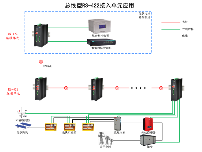 RS-422總線級聯型接入單元已經廣泛應用在光伏太陽能發電站現場和控制中心的匯流箱、直流配電柜、逆變器、交流配電柜、箱式和房式變壓系統、電能計量系統、環境和氣候監測儀、數據采集器、通信控制機、視頻監控云臺及報警控制、消防系統、風機系統、各種保護和開關裝置、RTU及配電裝置、以及各種現場遙控、遙測、遙信自動控制和監測裝置中。