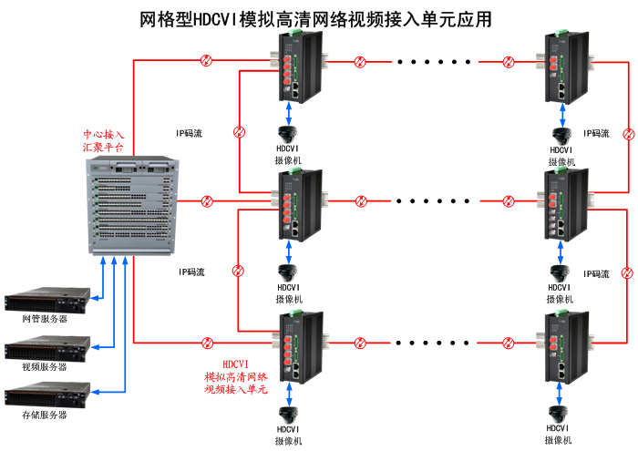 1/2/3/4路HDCVI模擬高清網絡視頻網格型接入單元,2/4/6/8光2電百兆/千兆以太網接口,1路雙向音頻/報警開關量/控制數據,單模/多模/塑料,1/2纖,獨立/冗余供電,壁掛,高可靠型 |