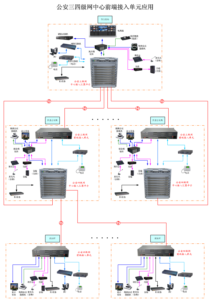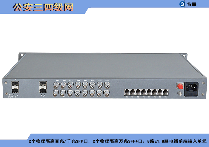 公安三四級網前端接入單元,4個物理隔離百兆/千兆SFP口,8/16/32/48/64路模擬電話/程控交換機接口可選,4/8/16路E1接口可選,8路雙向視頻、8路雙向音頻、8路雙向數據,背板供電,19英寸1/2/3U機箱,通用型/工業型。 |