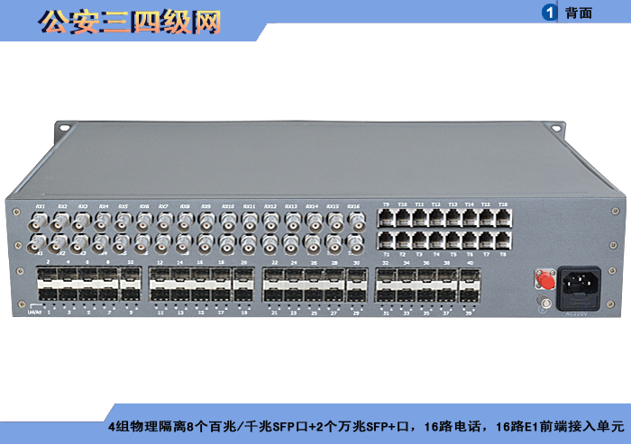 公安三四級網前端接入單元,4組物理隔離8個百兆/千兆SFP與2個萬兆SFP+共享口,8/16/32/48/64路模擬電話/程控交換機接口可選,4/8/16路E1接口可選,背板供電,19英寸1/2/3U機箱,通用型/工業型。 |