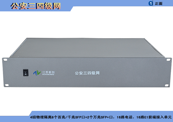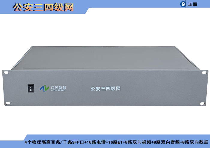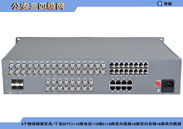 公安三四級網前端接入單元,4個物理隔離百兆/千兆SFP口,8路雙向視頻、8路雙向音頻、8路雙向數據,背板供電,19英寸1/2/3U機箱,通用型/工業型。 |