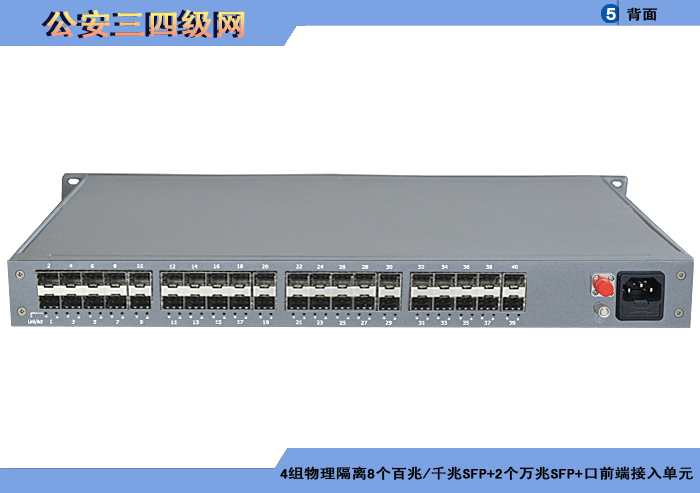 公安三四級網前端接入單元,4組物理隔離8個百兆/千兆SFP與2個萬兆SFP+共享口,背板供電,19英寸1/2/3U機箱,通用型/工業型。 |