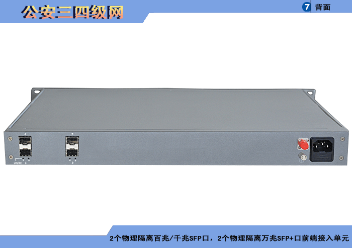 公安三四級網前端接入單元,2個物理隔離百兆/千兆SFP口,2個物理隔離萬兆SFP+共享口,背板供電,19英寸1U機箱,通用型/工業型。 |