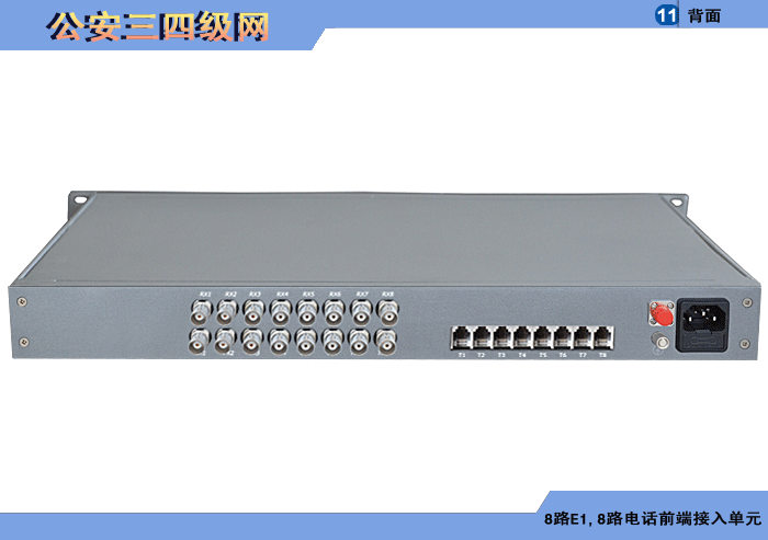 公安三四級網前端接入單元,4/8/16路E1接口可選,背板供電,19英寸1U機箱,通用型/工業型。 |