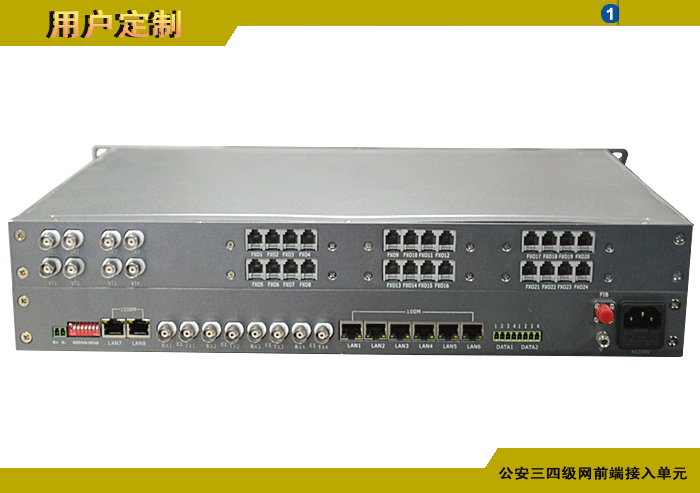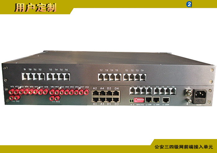 公安三四級網前端接入單元,24路模擬電話/程控交換機接口可選,4路E1接口可選,背板供電,19英寸1/2/3U機箱,通用型/工業型。 |