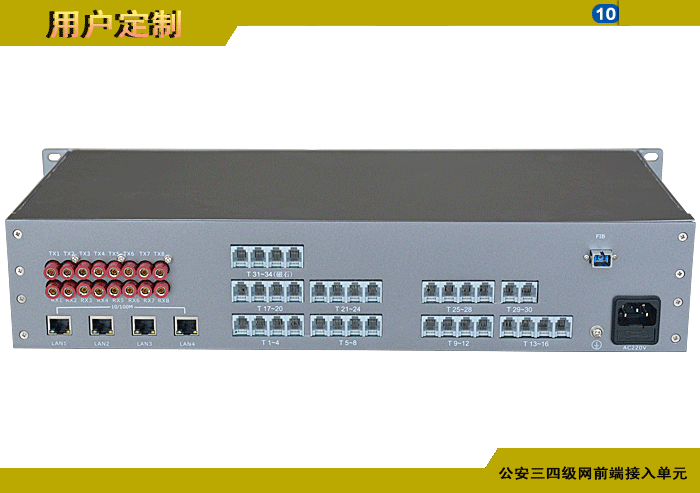 公安三四級網前端接入單元,32路模擬電話/程控交換機接口可選,背板供電,19英寸1/2/3U機箱,通用型/工業型。 |