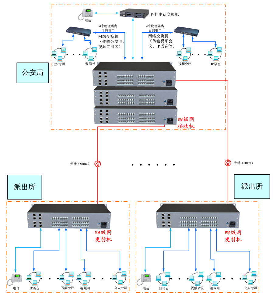 公安三四級網前端接入單元采用高速傳輸光通信技術、視音頻圖像處理、高速網絡、電信語音及復用技術,將公安內部網及行政信息網的多路百兆/千兆/萬兆以太網、公安三四級網的治安監控多路圖像信號及控制數據、會議電視的視音頻數據信號、用于語音電話通信及其它電信業務的多路E1/G.703等2M基本速率接口、局內電話交換機/分機系統、交通卡口控制信號及圖像視音頻信號、交通電子警察、流量檢測多種綜合業務整合在單芯光纖上無失真、高質量傳輸,實現派出所、交通卡口、公安下屬分支機構與各分局、市局遠距離聯網通信。