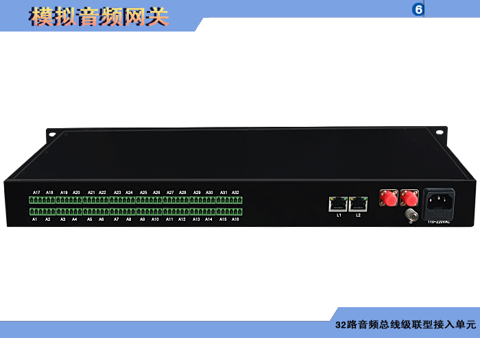 32路模擬音頻網關總線級聯型接入單元,2光2電百兆/千兆以太網接口,多路控制數據/報警開關量可選,單模/多模/塑料,1/2纖,ST/FC/SC/LC/SFP光接口,15/20/25/32dB,獨立/冗余供電,1U機架,通用型 |