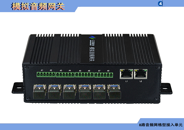 8路模擬音頻網關網格型接入單元,2/4/6/8光2電百兆/千兆以太網接口,多路控制數據/報警開關量可選,單模/多模/塑料,1/2纖,ST/FC/SC/LC/SFP光接口,15/20/25/32dB,獨立/冗余供電,壁掛,通用型 |