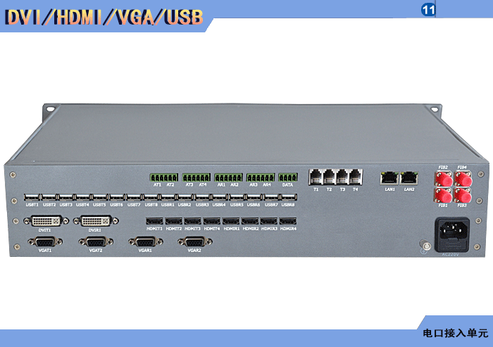 遠程高標清數字化法庭系統電口接入單元,1/2/4/8路DVI/HDMI/DP/VGA/YPbPr攝像機電口輸入,1/2/4/8路DVI/HDMI/DP/VGA/YPbPr顯示屏電口輸出,1/2/4/8路模擬/數字雙向立體聲音頻可選,1/2/4/8路可選數據,多路電話或百兆/千兆以太網可選,單模/多模,獨立/冗余供電,1/2/3/4U機架,非網管/網管/帶光纖數字診斷網管 |