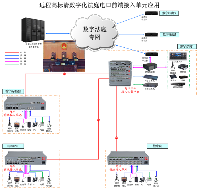 遠程高標清數字化法庭系統電口接入單元,1/2/4/8路HDCI/DVI/HDMI/DP/VGA/YPbPr/3G/HD-SDI/模擬標清視頻攝像機電口輸入,1/2/4/8路DVI/HDMI/DP/VGA/YPbPr/3G/HD-SDI/模擬標清視頻顯示屏電口輸出,1/2/4/8路模擬/數字雙向立體聲音頻可選,1/2/4/8路可選數據,多路電話或百兆/千兆以太網可選,單模/多模,獨立/冗余供電,1/2/3/4U機架,非網管/網管/帶光纖數字診斷網管 |