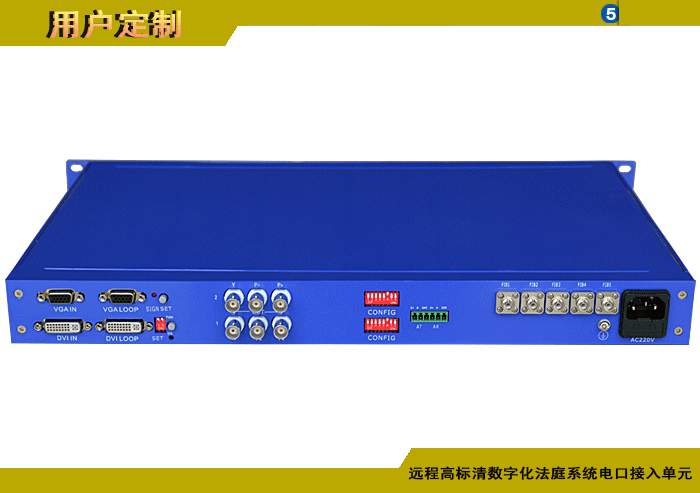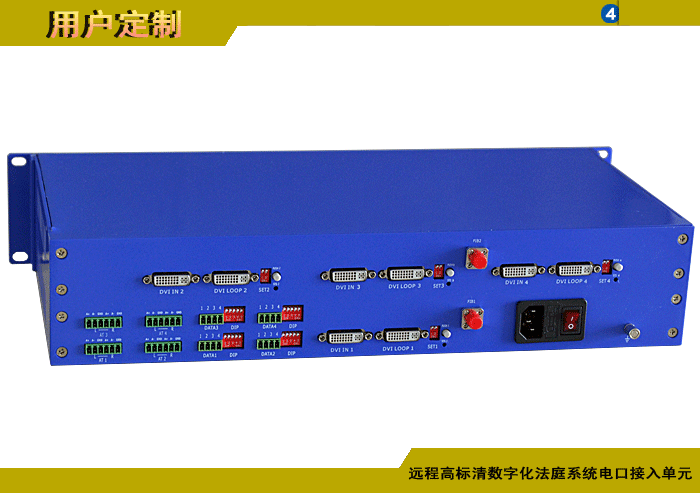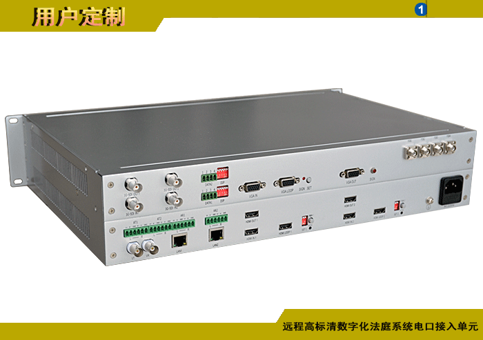 遠程高標清數字化法庭系統電口接入單元,1/2/4/8路DVI/HDMI/DP/VGA/YPbPr/模擬標清視頻攝像機電口輸入,1/2/4/8路DVI/HDMI/DP/VGA/YPbPr/模擬標清視頻顯示屏電口輸出,1/2/4/8路模擬/數字雙向立體聲音頻可選,1/2/4/8路可選數據,多路電話或百兆/千兆以太網可選,單模/多模,獨立/冗余供電,1/2/3/4U機架,非網管/網管/帶光纖數字診斷網管 |