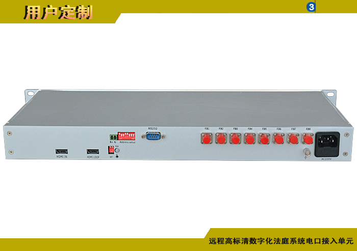 遠程高標清數字化法庭系統電口接入單元,1/2/4/8路HDMI/VGA/YPbPr/模擬標清視頻攝像機電口輸入,1/2/4/8路HDMI/VGA/YPbPr/模擬標清視頻顯示屏電口輸出,1/2/4/8路模擬/數字雙向立體聲音頻可選,1/2/4/8路可選數據,多路電話或百兆/千兆以太網可選,單模/多模,獨立供電,4U機架,非網管/網管/帶光纖數字診斷網管 |