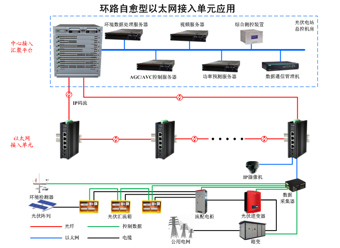 以太網環網自愈型接入單元已經廣泛應用在光伏太陽能發電站現場和控制中心的匯流箱、直流配電柜、逆變器、交流配電柜、箱式和房式變壓系統、電能計量系統、環境和氣候監測儀、數據采集器、通信控制機、視頻監控云臺及報警控制、消防系統、風機系統、各種保護和開關裝置、RTU及配電裝置、以及各種現場遙控、遙測、遙信自動控制和監測裝置中。