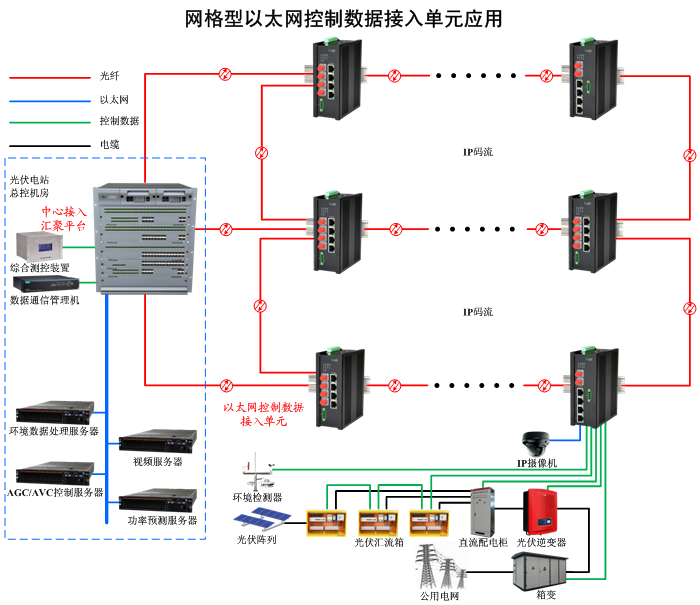 以太網控制數據網格型接入單元已經廣泛應用在光伏太陽能發電站現場和控制中心的匯流箱、直流配電柜、逆變器、交流配電柜、箱式和房式變壓系統、電能計量系統、環境和氣候監測儀、數據采集器、通信控制機、視頻監控云臺及報警控制、消防系統、風機系統、各種保護和開關裝置、RTU及配電裝置、以及各種現場遙控、遙測、遙信自動控制和監測裝置中。