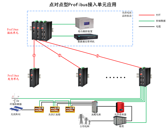 Profibus點對點接入單元已經廣泛應用在光伏太陽能發電站現場和控制中心的匯流箱、直流配電柜、逆變器、交流配電柜、箱式和房式變壓系統、電能計量系統、環境和氣候監測儀、數據采集器、通信控制機、視頻監控云臺及報警控制、消防系統、風機系統、各種保護和開關裝置、RTU及配電裝置、以及各種現場遙控、遙測、遙信自動控制和監測裝置中。