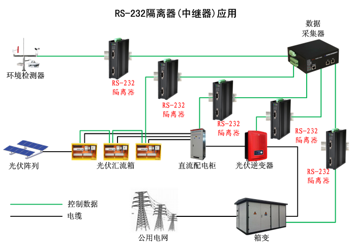 RS-232隔離器(中繼器)已經廣泛應用在光伏太陽能發電站現場和控制中心的匯流箱、直流配電柜、逆變器、交流配電柜、箱式和房式變壓系統、電能計量系統、環境和氣候監測儀、數據采集器、通信控制機、視頻監控云臺及報警控制、消防系統、風機系統、各種保護和開關裝置、RTU及配電裝置、以及各種現場遙控、遙測、遙信自動控制和監測裝置中。