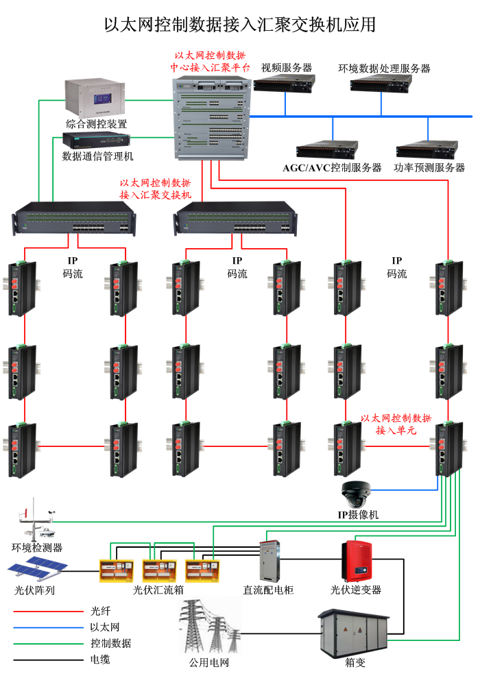 以太網控制數據接入匯聚交換機已經廣泛應用在光伏太陽能發電站現場和控制中心的匯流箱、直流配電柜、逆變器、交流配電柜、箱式和房式變壓系統、電能計量系統、環境和氣候監測儀、數據采集器、通信控制機、視頻監控云臺及報警控制、消防系統、風機系統、各種保護和開關裝置、RTU及配電裝置、以及各種現場遙控、遙測、遙信自動控制和監測裝置中。
