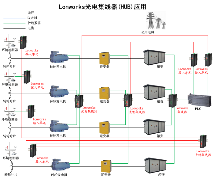 Lonworks光電集線器(HUB)已經(jīng)廣泛應(yīng)用在風(fēng)力發(fā)電站現(xiàn)場(chǎng)和控制中心的塔座主控制器機(jī)柜、機(jī)艙控制站機(jī)柜、變槳距系統(tǒng)、變流器系統(tǒng)、大功率變流器通訊 偏航系統(tǒng)、發(fā)電機(jī)系統(tǒng)、液壓系統(tǒng)、增速齒輪箱系統(tǒng)、氣象系統(tǒng)、現(xiàn)場(chǎng)觸摸屏站、升壓站、開(kāi)關(guān)柜、風(fēng)機(jī)控制、保護(hù)和測(cè)控柜、繼電和配電保護(hù)裝置、各種傳感器和檢測(cè)系統(tǒng)、視頻監(jiān)控云臺(tái)及報(bào)警控制、消防系統(tǒng)、以及各種現(xiàn)場(chǎng)遙控、遙測(cè)、遙信自動(dòng)控制和監(jiān)測(cè)裝置中。