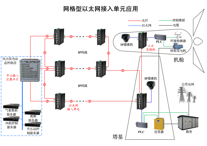 以太網網格型接入單元已經廣泛應用在風力發電站現場和控制中心的塔座主控制器機柜、機艙控制站機柜、變槳距系統、變流器系統、大功率變流器通訊 偏航系統、發電機系統、液壓系統、增速齒輪箱系統、氣象系統、現場觸摸屏站、升壓站、開關柜、風機控制、保護和測控柜、繼電和配電保護裝置、各種傳感器和檢測系統、視頻監控云臺及報警控制、消防系統、以及各種現場遙控、遙測、遙信自動控制和監測裝置中。