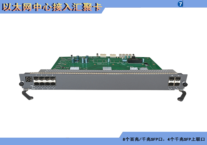 配置 以太網中心接入匯聚卡,8個百兆/千兆 SFP口,4個萬兆SFP上聯口,L2/L3層交換,可堆疊,背板供電,19英寸插卡,通用型/工業型。