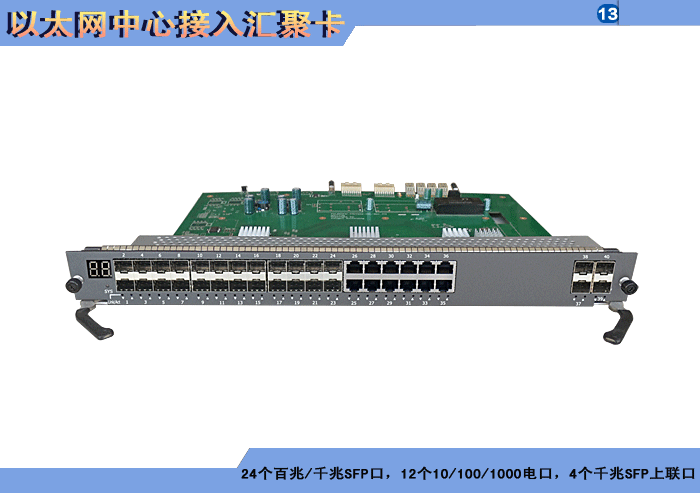 配置 以太網中心接入匯聚卡,24個百兆/千兆 SFP口,4個萬兆SFP上聯口,L2/L3層交換,可堆疊,背板供電,19英寸插卡,通用型/工業型。