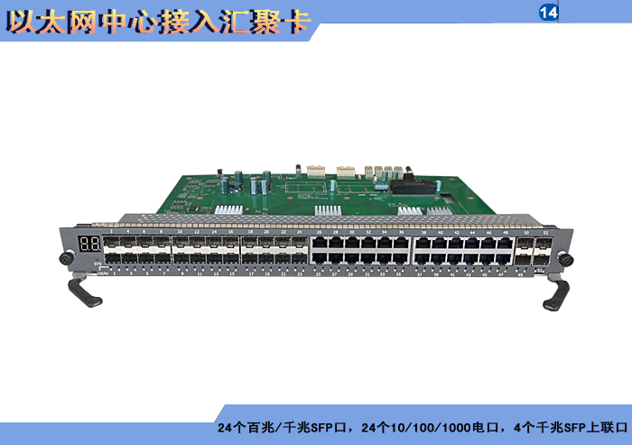 配置 以太網中心接入匯聚卡,24個百兆/千兆 SFP口,24個10/100/1000電口,4個千兆SFP上聯口,L2/L3層交換,可堆疊,背板供電,19英寸插卡,通用型/工業型。