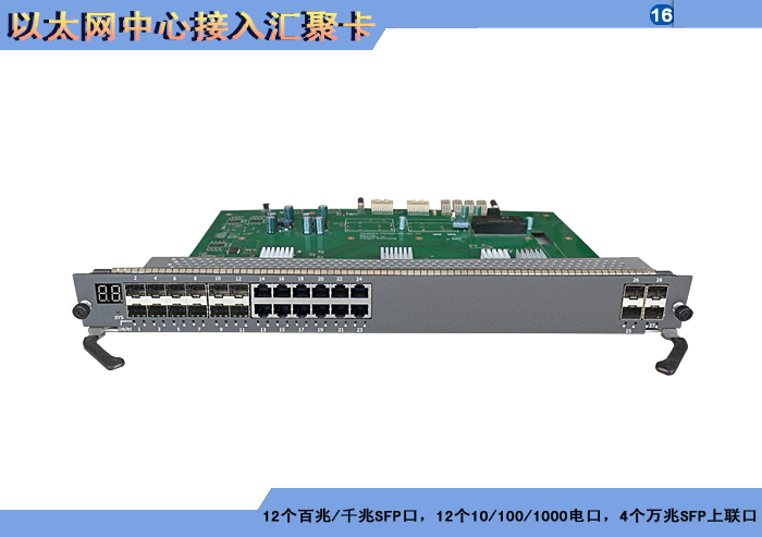 配置 以太網中心接入匯聚卡,12個百兆/千兆 SFP口,12個10/100/1000電口,4個千兆SFP上聯口,L2/L3層交換,可堆疊,背板供電,19英寸插卡,通用型/工業型。
